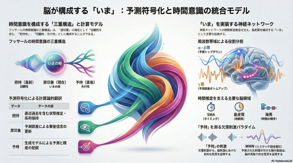 予測符号化と現象学的時間意識の統合研究は、「なぜ私たちは時間の流れを感じるのか」という根本問題に計算論的・神経科学的な回答を模索する試みだ。