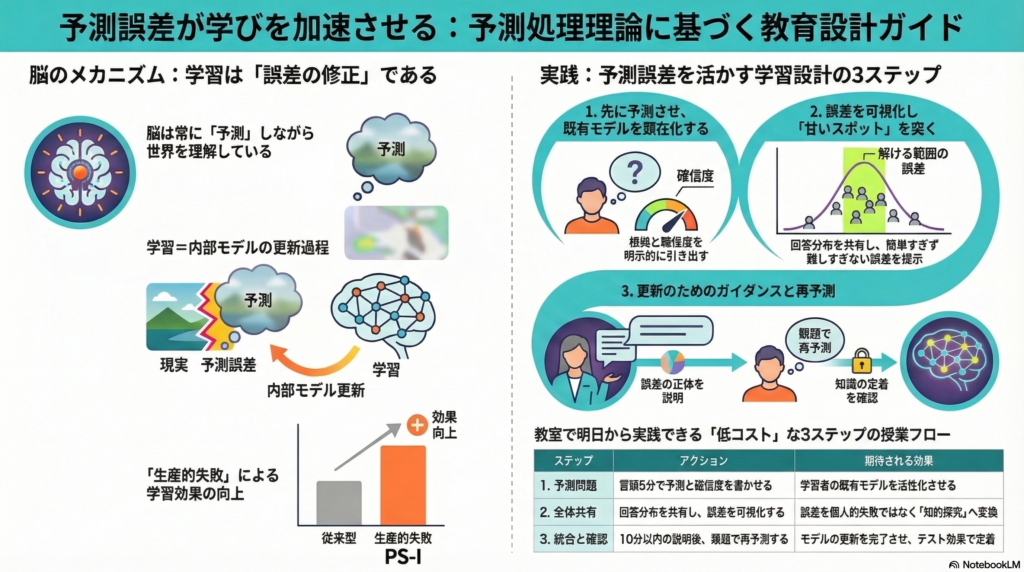 また板書やスライドで「予測」と「実際の結果」を並べて差分を可視化することも、精度(注意の重み付け)を設計する観点から有効だ。どこに注意を向けるべきかを教材提示の時点でコントロールすることが、誤差修正の成否を左右する。