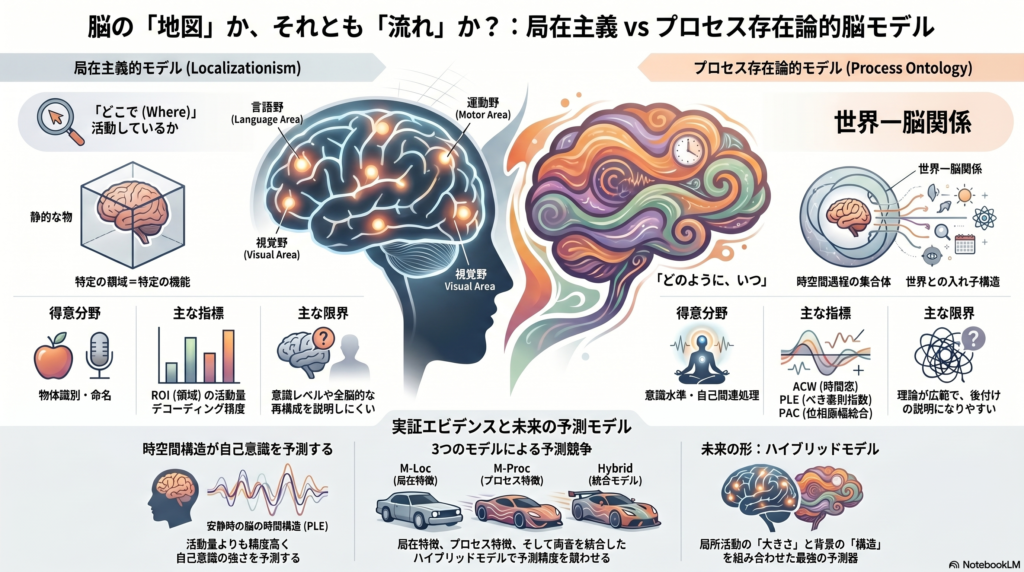 本記事では、局在主義的モデルとプロセス存在論的脳モデルの理論的前提・実証エビデンス・研究設計上の特徴を体系的に比較し、両者がどのような課題で競合し、どこに研究の最前線があるかを整理する。