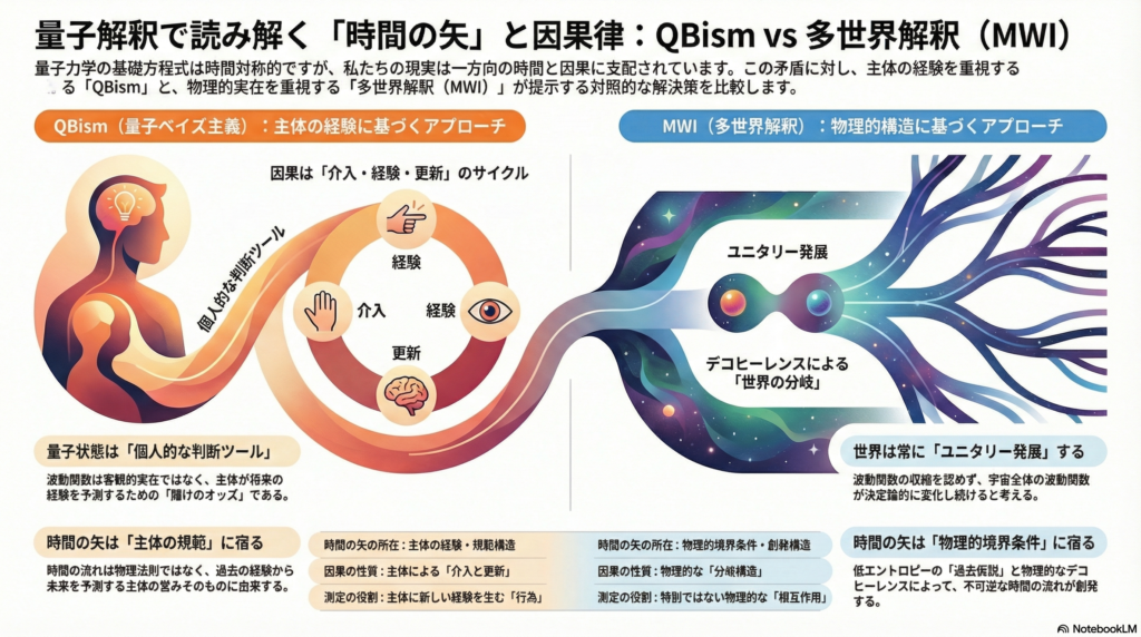 QBismは主体経験の非可逆性と信念更新を軸に時間・因果を構成し、デコヒーレンスすら物理過程としては認めない急進的な立場をとる。MWIは普遍波動関数のユニタリー発展を基礎に、デコヒーレンスと過去仮説から時間の矢を「物理の内側で」説明しようとする。