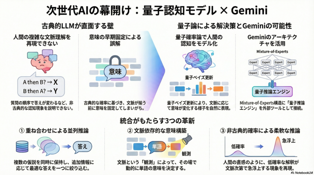 こうした背景から、量子確率論に基づく認知モデルとLLMを統合する研究が注目を集めています。量子力学の原理を取り入れることで、従来モデルでは説明困難だった文脈依存的な意味変化や非線形な推論プロセスを自然に表現できる可能性があるためです。特にGoogle DeepMindのGeminiのような最先端LLMは、その高い拡張性から量子的要素を組み込む土台として期待されています。