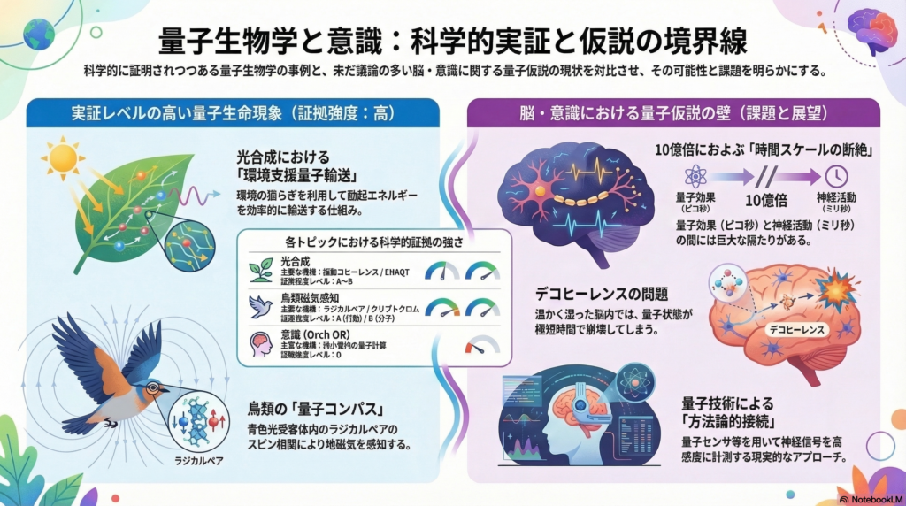 「量子」という言葉はしばしば神秘的なニュアンスで語られがちですが、量子生物学はあくまで厳密な実験科学です。光合成のエネルギー移動や鳥の方位感覚を支える分子機構が、古典物理だけでは説明しにくい量子力学的ダイナミクスを活用している可能性が、超高速分光やスピン化学の手法によって示されつつあります。一方で、「量子効果が意識を生み出す」という主張は、実証レベルでは大きな開きがあります。本記事では、比較的証拠の整った光合成・鳥類磁気感知の知見を「参照点」に、脳・意識研究における量子仮説の現在地を批判的に整理します。
