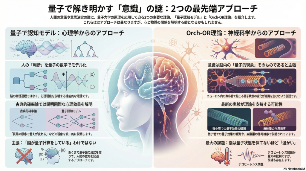 量子認知モデルと脳内量子過程は、アプローチも目的も異なる領域ですが、「人間の心的現象に量子の原理が関与しているかもしれない」という点で接点を持っています。