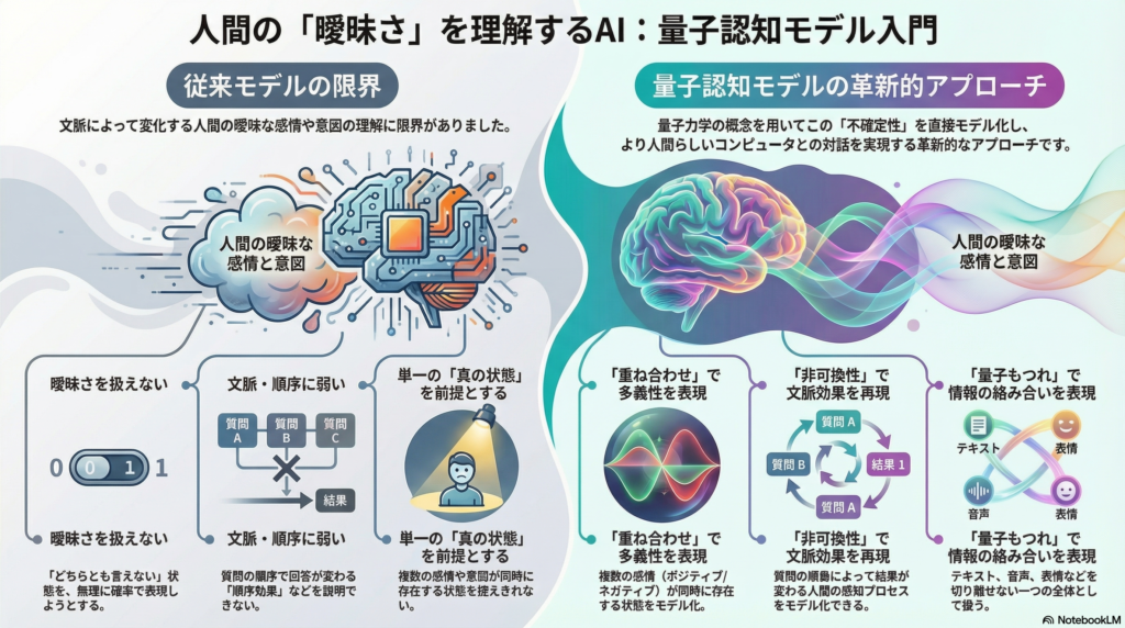 しかし量子モデルでは、状態そのものを重ね合わせのまま保持でき、文脈に応じて確率が干渉して変化するため、人間の直感的な判断プロセスを直接的に模倣できます。例えば、人間が「どちらとも言えない」と感じるグレーな感情について、古典モデルは無理に50%ポジティブ・50%ネガティブといった混合分布で表現しますが、量子モデルは純粋状態の重ね合わせとして扱い、解釈が決まっていない状態そのものを表現します。