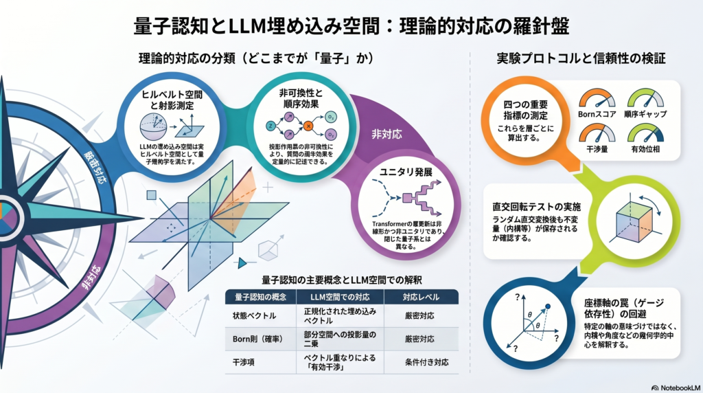 本記事では、量子認知の中核概念(ヒルベルト空間・射影測定・干渉・非可換性)と、BERT・RoBERTa・GPT-2といったモデルの埋め込み空間がどこまで対応し、どこから先は単なるアナロジーにとどまるのかを、数式レベルで丁寧に切り分ける。対応関係を「厳密対応」「条件付き対応」「構成的類推」「非対応」に分類しながら論じることで、両分野を横断する研究者や実務家が理論的に安全に扱える範囲を明確にすることが本記事の目的である。