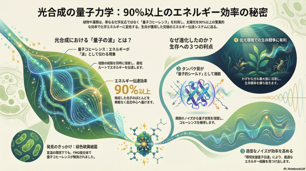 本記事では、複数の光合成生物で観測されている量子コヒーレンスの実態と、その進化的獲得過程における適応的意義を探る。また、分子レベルでどのような構造変化が起こり、この量子的メカニズムが生物にとって真に有利であったのかを科学的根拠に基づいて考察する。