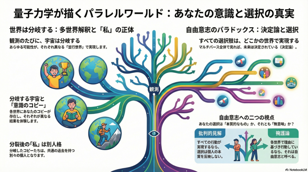 この構造が自由意志の議論を複雑にします。すべての選択肢がどこかの分岐で実現するなら、「私はAを選んだが、他の世界の私はBを選んだ」という状況が生じます。