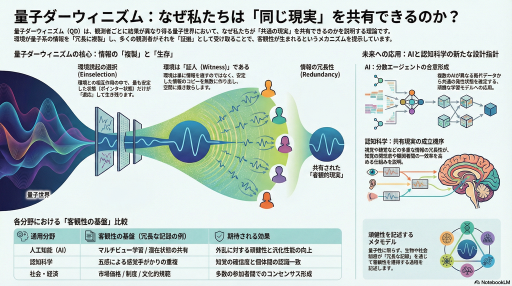 本記事では、量子ダーウィニズムの核心概念を整理したうえで、生物学・認知科学・AIへの応用可能性と、その限界・注意点までを体系的に解説する。