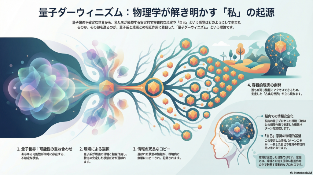 環境誘起デコヒーレンスという物理過程が、なぜ私たちが「私」として存在し、一貫した世界を経験するのかを説明する鍵となる可能性がある。量子的基盤から古典的現実が創発するメカニズムと、物質から意識が創発するメカニズムには、深い共通性があるのかもしれない。
