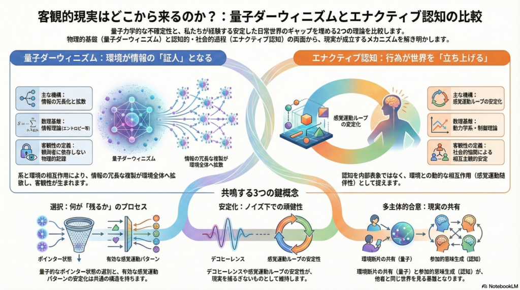 機構の差異: 量子ダーウィニズムは「情報の選択→冗長複製→拡散」という情報論的・物理的機構で客観性を与える。エナクティブ認知は「感覚運動ループの安定化と自律性」という生物学的・現象学的機構で経験的世界を成立させる。前者が「記録の物理」であるとすれば、後者は「行為の現象学」である。