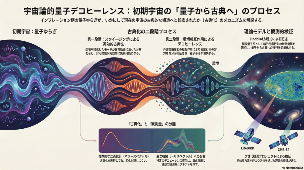 この問いは単なる形而上学的興味ではない。どのようなメカニズムで量子から古典への移行が起きるかによって、CMBの非ガウス性や原始重力波スペクトルへの可観測な補正が生まれる可能性がある。現在稼働中・計画中の観測装置(LiteBIRD、CMB-S4、DESI、SKAO)が将来提供するデータを正しく解釈するためにも、この理論的基盤の整理は急務といえる。