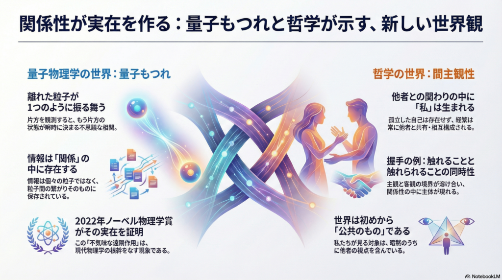 量子物理学の量子もつれ現象と、哲学における間主観性の理論。これらは一見まったく異なる世界の話に思えます。しかし、21世紀の学際的研究が明らかにしつつあるのは、両者に共通する根本的な構造です。それは「個体や部分よりも、関係性が先立つ」という発想です。