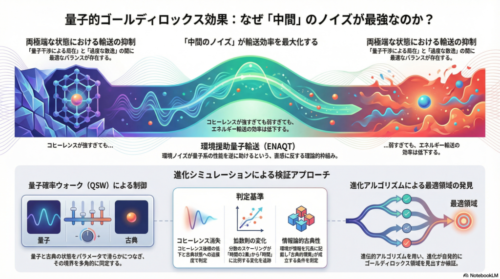 ただし重要な注意点がある。ゴールディロックス曲線が現れること自体は干渉と散逸の競合構造から比較的容易に生じるものであり、「量子が常に有利」を意味するわけではない。また古典化の判定にはコヒーレンス消失だけでは不十分で、複数の指標の同時成立によって定義すべきである。進化的検証においては、最大効率だけでなく探索地形の構造(局所最適の多さ、頑健な台地の存在)が本質的に重要になる。