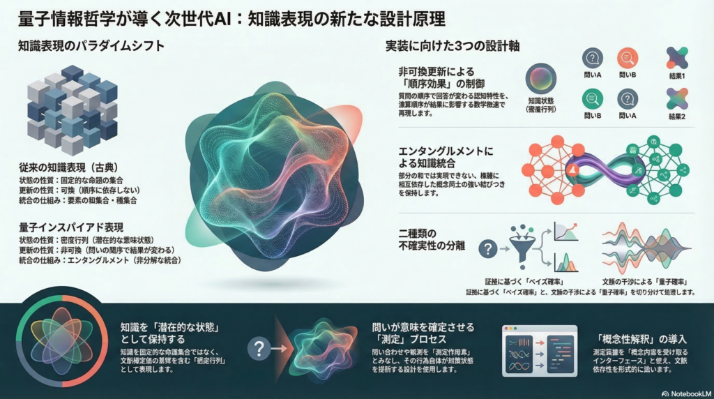 本記事では、量子情報哲学の「概念性解釈」を媒介として、量子形式(密度行列・測定作用素・エンタングルメント)が知識表現論にもたらす設計原理を整理した。
