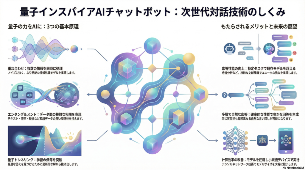 量子力学にインスパイアされたニューラルネットワークを用いたチャットボット技術は、重ね合わせ、エンタングルメント、量子トンネリングといった量子的特性を活用することで、従来の深層学習に新たなアプローチをもたらしています。