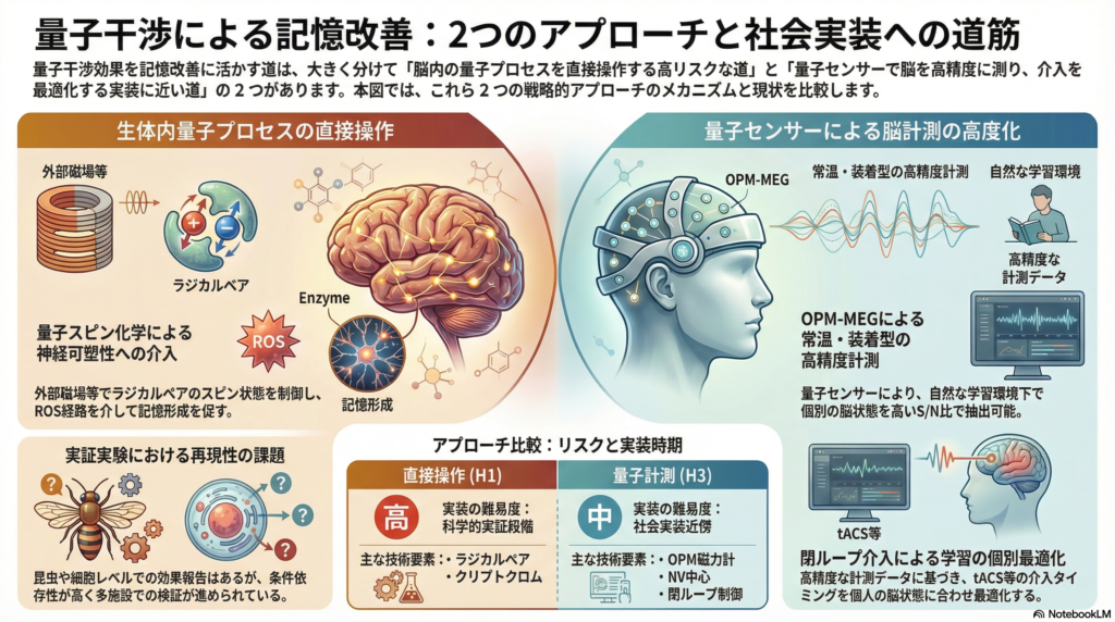 量子干渉を記憶改善に活かす研究アプローチは、大きく2種類に分類できる。「生体内の量子干渉を直接操作して可塑性を上げる」高リスク・高インパクト路線(H1/H2)と、「量子センサーで脳状態を高精度に推定し、閉ループ介入で学習を最適化する」実装近傍路線(H3)だ。