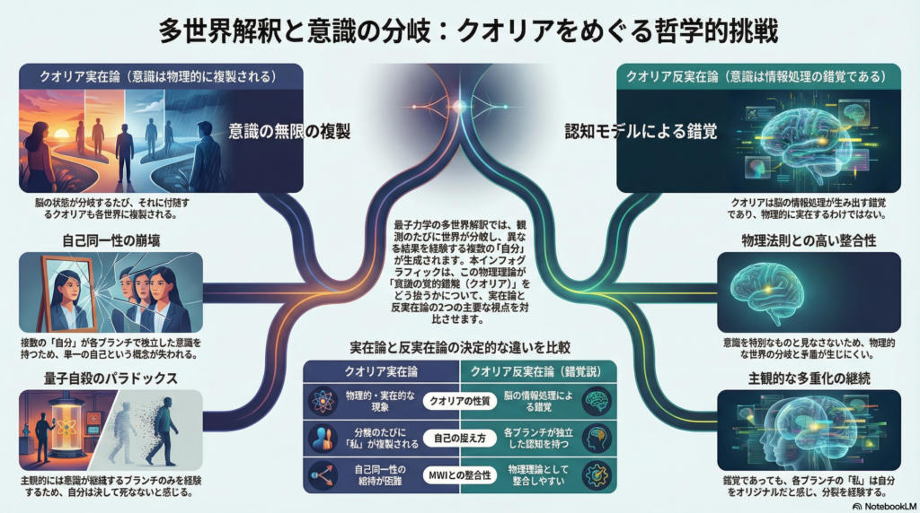 どちらの立場でも、多世界解釈はブランチごとにクオリアの「継続」や「消失」を異なる形で示し、主体性の一貫性に哲学的パラドックスをもたらす。あるブランチでは意識が継続し、別のブランチでは(観測者が死ぬなどして)消失する可能性がある。