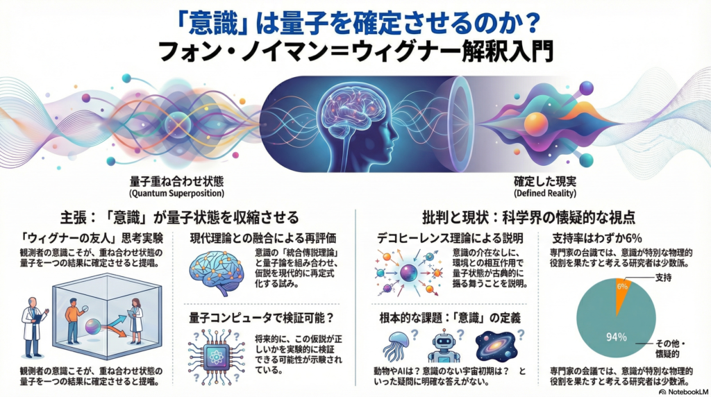 フォン・ノイマン=ウィグナー解釈は歴史的意義は大きいものの、現代の科学においては物理学的に必然性が薄く、未検証かつ概念的困難の多い解釈という位置づけです。現在では大多数の物理学者により退けられているのが実情です。