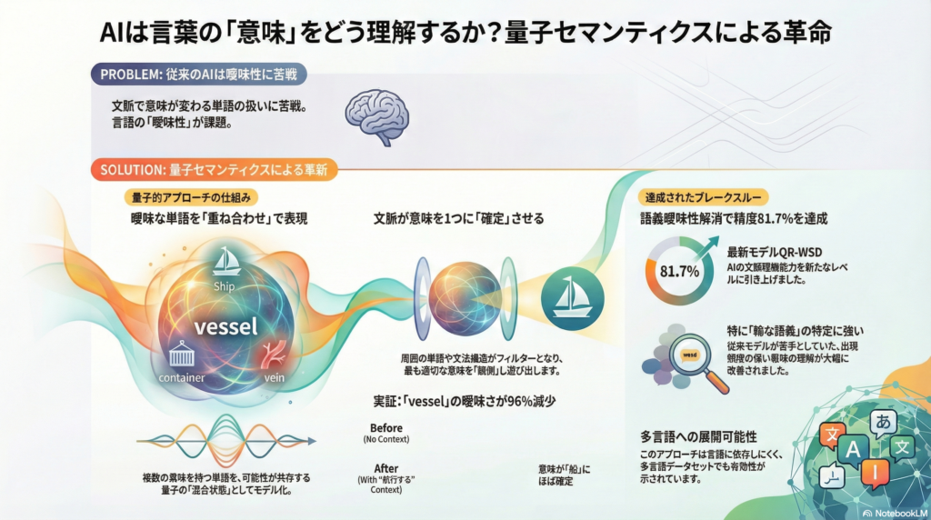 本記事では、量子的発想に基づくディストリビューショナル意味論の基本概念から、語義曖昧性解消(WSD)タスクでの具体的成果、他言語への展開可能性まで、最新の研究動向を包括的に紹介します。