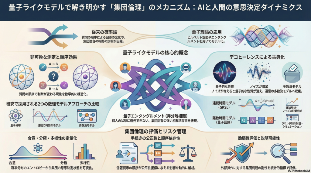 AIシステムが社会的意思決定に関与する場面が増える中、「複数のエージェントが互いに影響し合うとき、集団としての倫理判断はどのように形成されるのか」という問いへの関心が高まっています。古典的な確率論やゲーム理論だけでは説明しにくい現象——たとえば質問の順序によって回答分布が変わる「順序効果」や、個人の判断の単純な集計では再現できない集団行動——を統一的に扱うための枠組みとして、量子理論の数学的構造を応用した「量子ライクモデル」が注目を集めています。