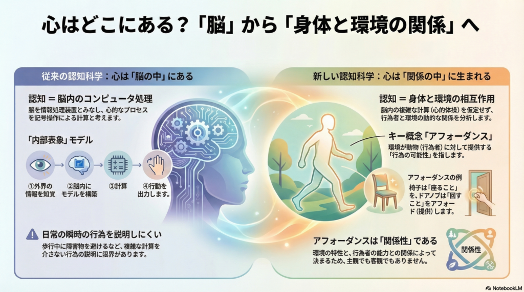 こうした疑問から、認知を「頭の中」だけで完結するプロセスではなく、身体と環境を含めた全体的なシステムとして理解しようとする動きが生まれました。