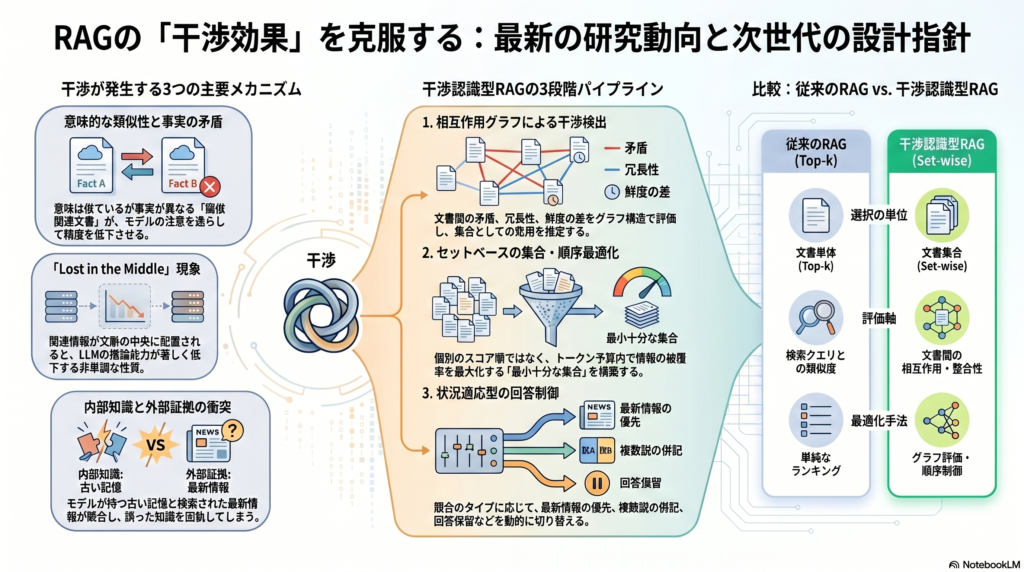 RAGの核心課題は「良い文書をk件選ぶこと」から、「相互作用する文書集合を限られたトークン予算でどう構成するか」に移っています。本記事では、この「干渉効果」の定義から検出・最適化手法まで、研究動向に沿って体系的に解説します。