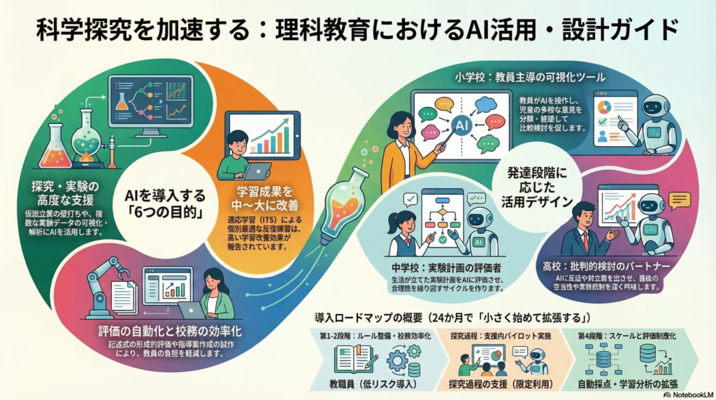 科学教育におけるAI活用は、単なるテクノロジー導入ではなく、**「学習活動の設計問題」**として捉える必要がある。観察・実験・考察・議論・振り返りという探究のプロセスそのものが学習成果であり、AIはそのプロセスを「短絡」させるのではなく「拡張」する形で組み込まなければならない。