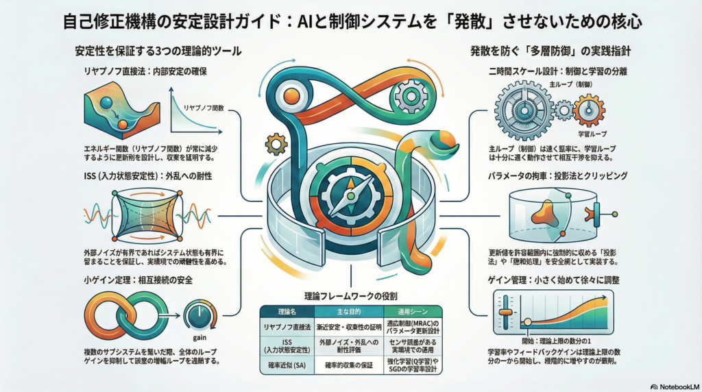 自己修正機構の安定性と収束性は、拡大状態(物理状態×学習状態)を一体として扱い、内部安定と外部安定の両面を確保することが出発点だ。理論的には、リヤプノフ直接法・ISS・小ゲイン条件・確率近似の四つの枠組みが補完的に機能し、線形・非線形・確率的・相互接続型の各設計状況に対応する。
