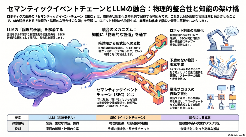 セマンティックイベントチェーンは、物体や状態変化を時系列で追うための形式的な枠組みとして、ロボット制御やコンピュータビジョンの領域で培われてきた概念です。一方でLLMは、テキストの生成・理解・要約において高い性能を示しながらも、論理的整合性や物理的因果関係の面に弱点を抱えています。