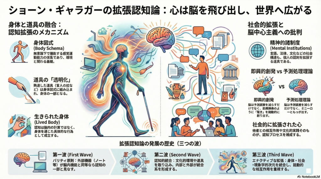 彼の理論の核心は、認知を個人の頭蓋内に閉じ込めず、身体的・社会的世界との共創的なプロセスとして捉え直した点にあります。メルロ=ポンティの身体図式概念を継承しつつ、道具使用による認知拡張、社会制度との関係、予測処理理論への批判的検討を通じて、ギャラガーは拡張認知論に現象学的深みを与えました。