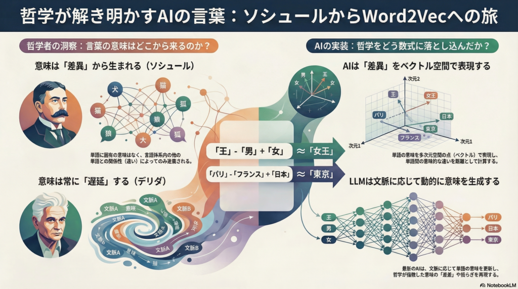 ソシュールが提示した差異に基づく言語構造の洞察は、Word2Vecのようなモデルに具体的手法として実装され、デリダが指摘した意味の揺らぎと生成性の問題は、AI時代における人間と機械の相互作用に新たな局面をもたらしています。