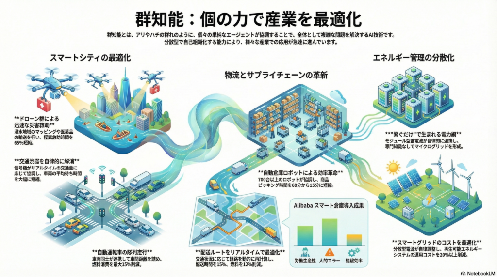 群知能アルゴリズムは、スマートシティの交通制御や災害対応、物流倉庫の自動化、エネルギー管理における分散制御など、多様な産業領域で実用化が進んでいます。IoTセンサーネットワークとAI技術の組み合わせにより、中央集権的な制御では対処困難だったリアルタイムな最適化が可能になりつつあります。