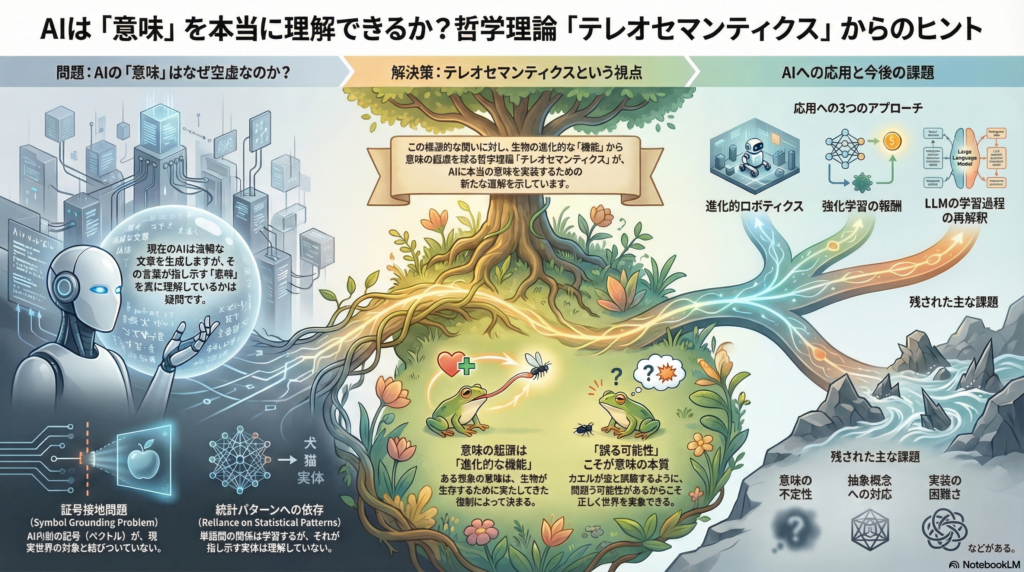 テレオセマンティクスは、AIの意味表象に新たな視座を提供する有力なアプローチです。進化的機能や目的という生物学的観点から「意味」を捉え直すことで、現在のAIが抱えるシンボルグラウンディング問題に対する一つの解答を示しています。