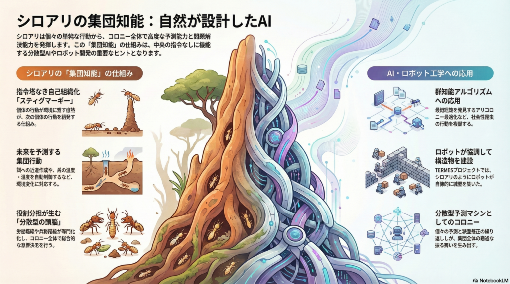 シロアリのコロニーに見られる分散協調と予測的適応は、人工知能分野における群知能モデルと多くの共通点を持ちます。群知能とは、多数のエージェントの自己組織化によって生じる知的振る舞いを研究する分野であり、アリやハチ、シロアリといった社会性昆虫の集団行動が重要なインスピレーション源となっています。