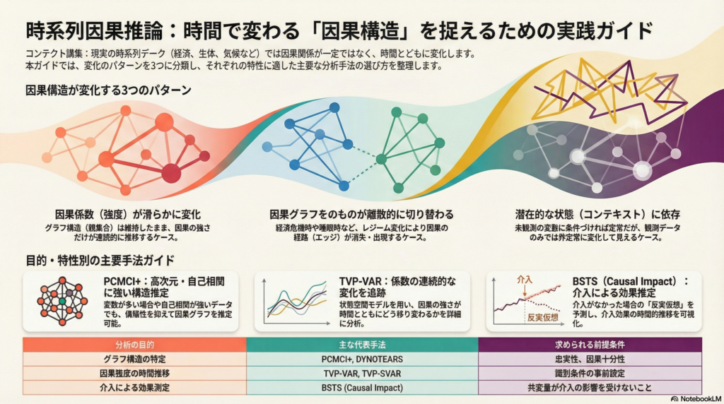 時間的に変化する因果構造への対応は、「係数変化か・グラフ変化か・潜在状態依存か」を最初に見極めることから始まる。実務では、PCMCI+ が高次元・自己相関下での構造推定に強みを発揮し、BSTS(Causal Impact)が介入効果の時間推移を直感的に可視化するのに向いている。TVP-SVAR は係数の滑らかな時間変化を扱いたい場合に有効だが、計算コストと識別の難しさを覚悟する必要がある。