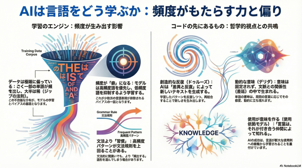 ChatGPTやClaude、Geminiなど、Transformerアーキテクチャに基づく大規模言語モデル(LLM)は、膨大なテキストデータから言語を学習します。これらのモデルがどのように「言葉の意味」を獲得し、文法的に正しい文章を生成できるのか——その背景には、訓練データ中の言語使用の頻度とパターンの反復が深く関わっています。