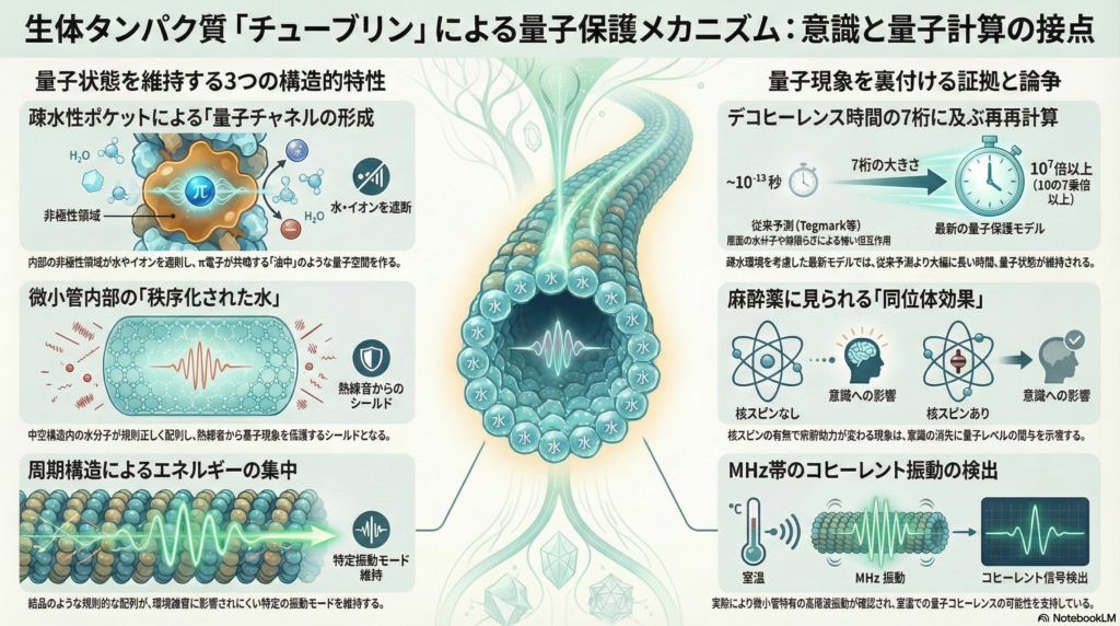 チューブリンや微小管における量子干渉現象の可能性と、そのデコヒーレンス保護メカニズムについて解説しました。疎水性ポケットにおける芳香族電子系、中空構造による秩序化水の存在、巨大分子の周期構造による雑音遮断など、生体が量子現象に寛容なニッチを内部に持つ可能性が示唆されています。