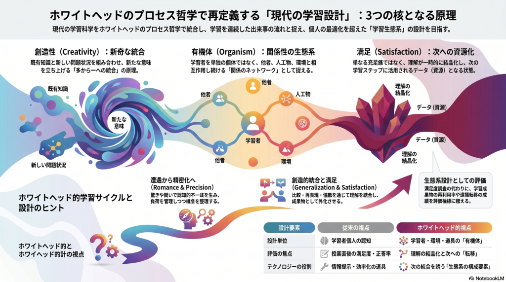 ホワイトヘッドの「創造性・有機体・満足」は、現代の学習科学と教育工学に対して、単なるメタファーを超えた中位理論の語彙を提供します。